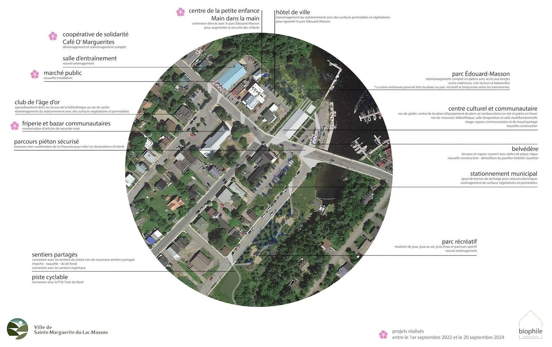 Biophile Architecture prepared this master plan as part of the public consultation process for the village center of La Ville de Sainte-Marguerite-du-Lac-Masson. Designed to open up discussion and consult citizens, it invites people to imagine a lively, human village where residents take the time to meet, share, and live in harmony with the surrounding nature. The project aims to be attentive to residents’ daily lives and values, creating a place where community and residents’ well-being guide every decision.